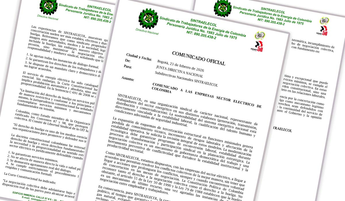 SINTRAELECOL, es una organización sindical de carácter nacional, representante de trabajadores del sector energético en sus distintos eslabones (generación, transmisión, distribución y comercialización). La sostenibilidad del sistema energético nacional está directamente vinculada a la estabilidad laboral, la cualificación del talento humano y condiciones adecuadas de seguridad industrial.